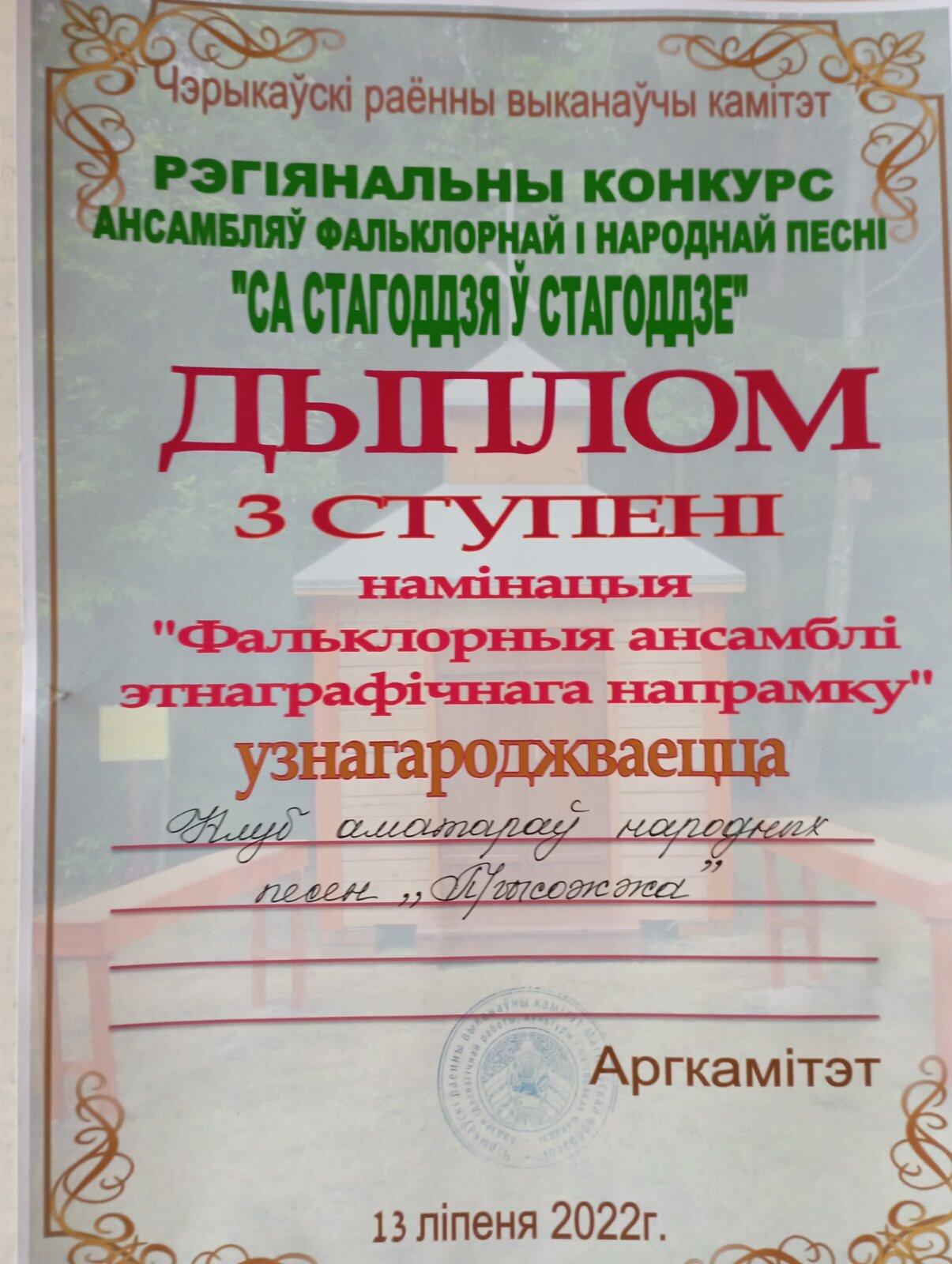 13 июля клуб любителей народных песен «Прысожжа» принял участие в IX региональном конкурсе фольклорной и народной песни «Из века в век» в д. Норки Чериковского района. Коллектив порадовал жюри душевными народными песнями. За что участники коллектива были награждены дипломом 3 степени в номинации «Фальклорныя ансамблі этнаграфічнага напрамку».