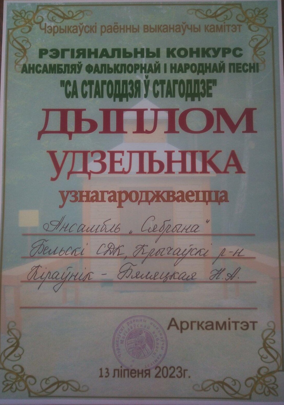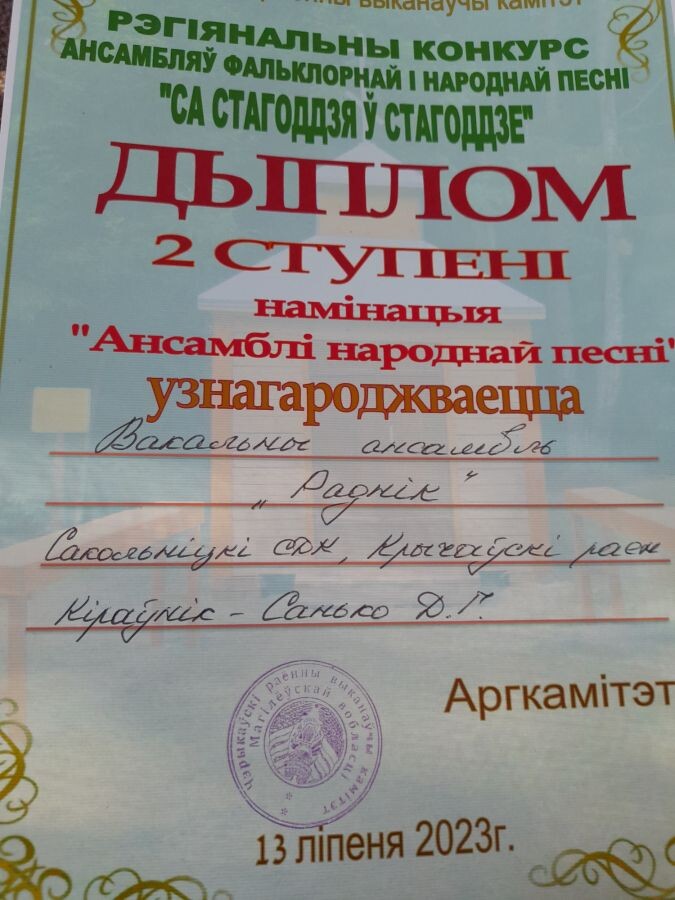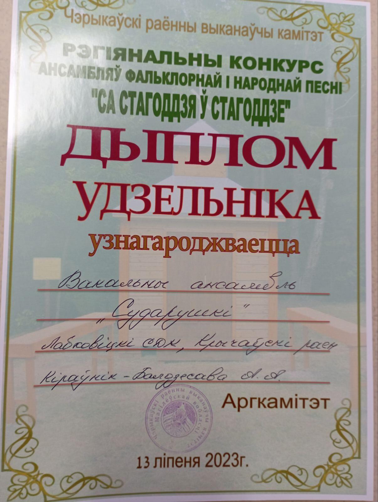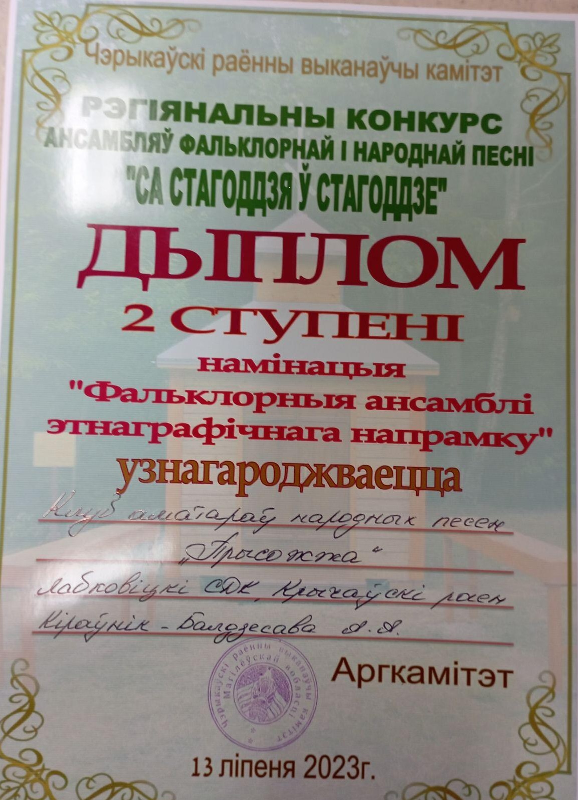 В номинации «Фольклорные ансамбли этнографического направления» клуб любителей народных песен «Прысожжа» Лобковичского СДК был удостоен дипломом 2 степени, в номинации «Ансамбли народной песни» вокальный ансамль «Раднік» Сокольничского СДК получил диплом 2 степени. Ансамль «Сябрыня» Бельского СДК и вокальный ансамбль «Сударушкі» были удостоены дипломами-участниками.