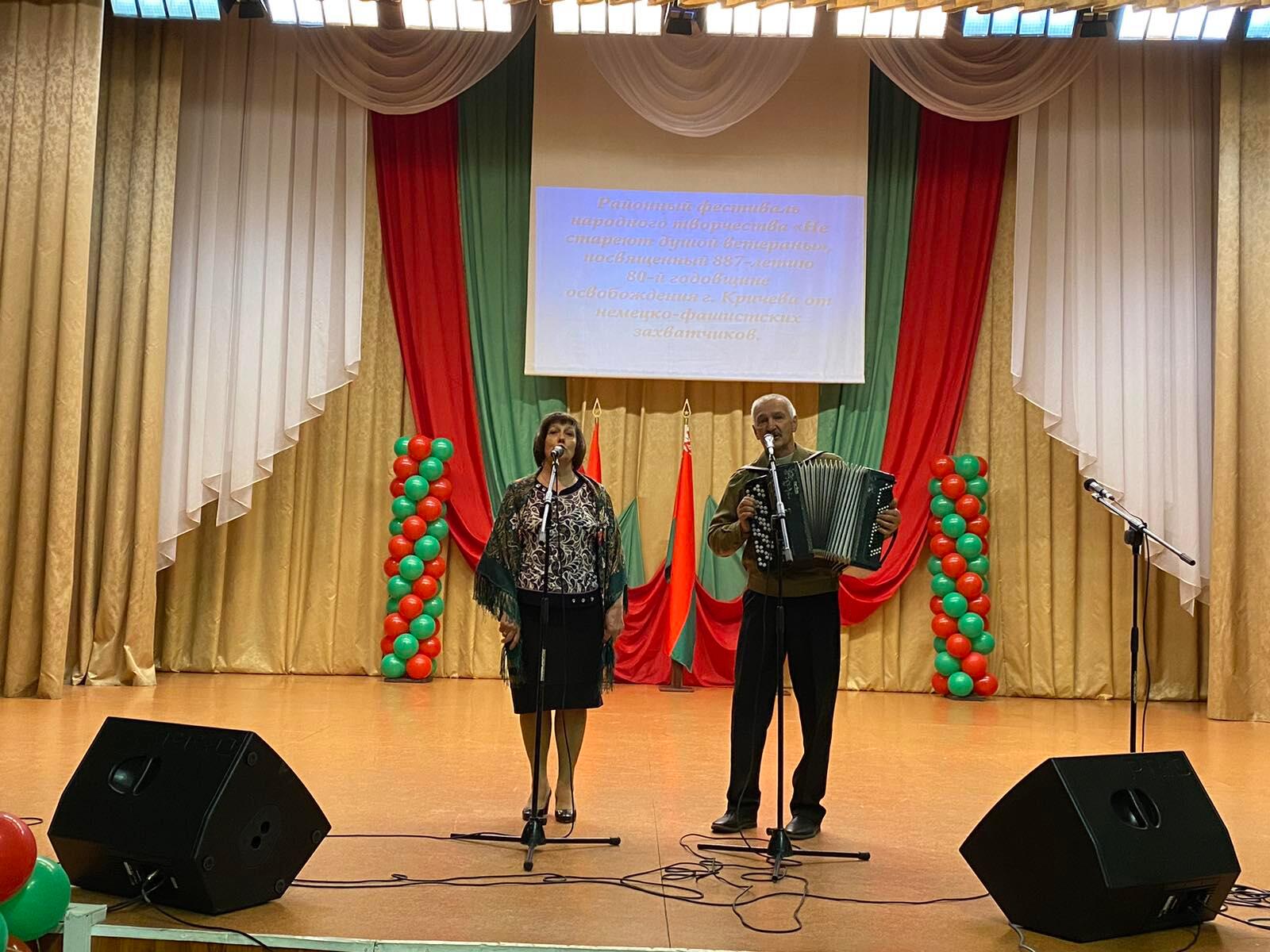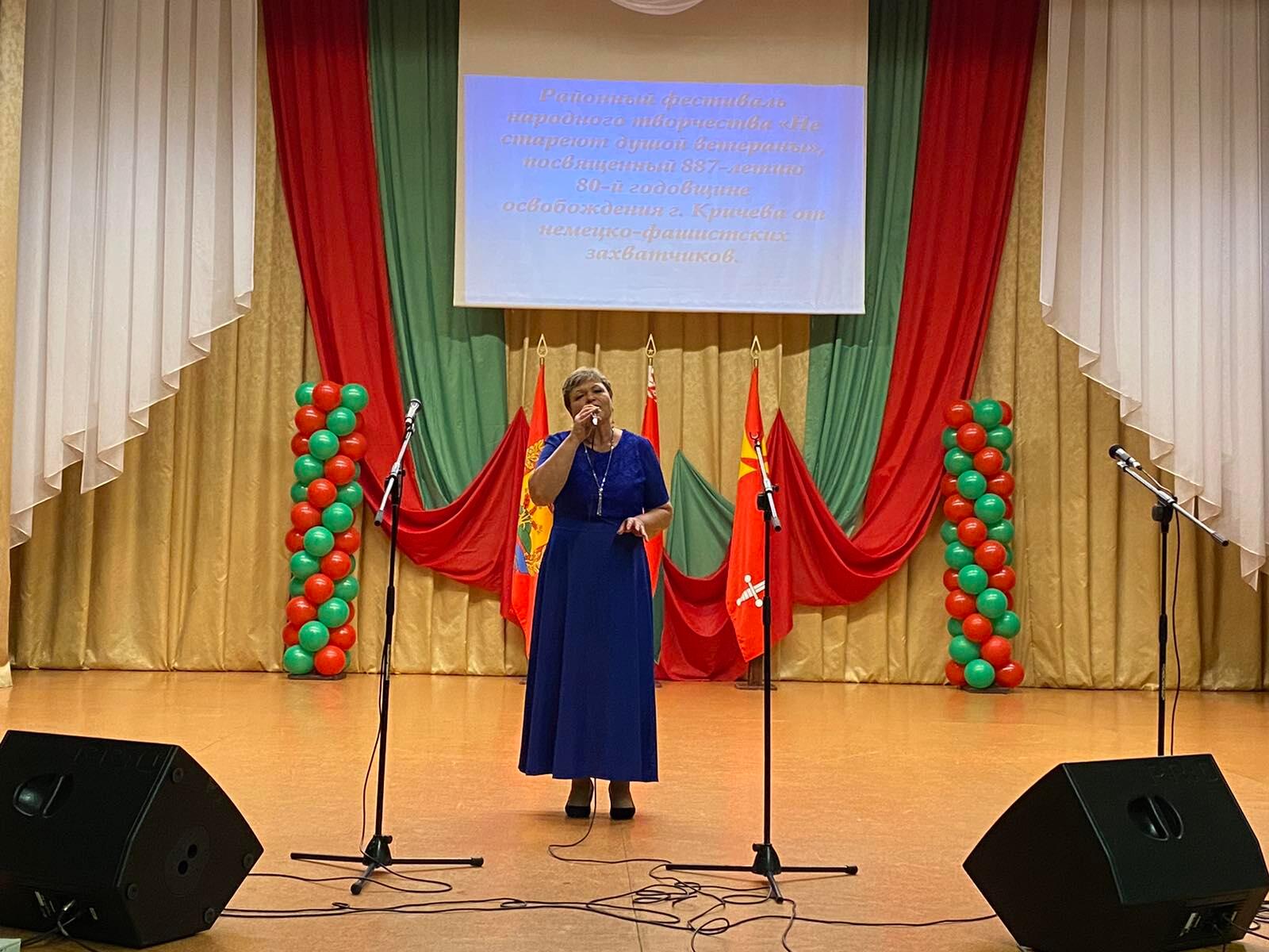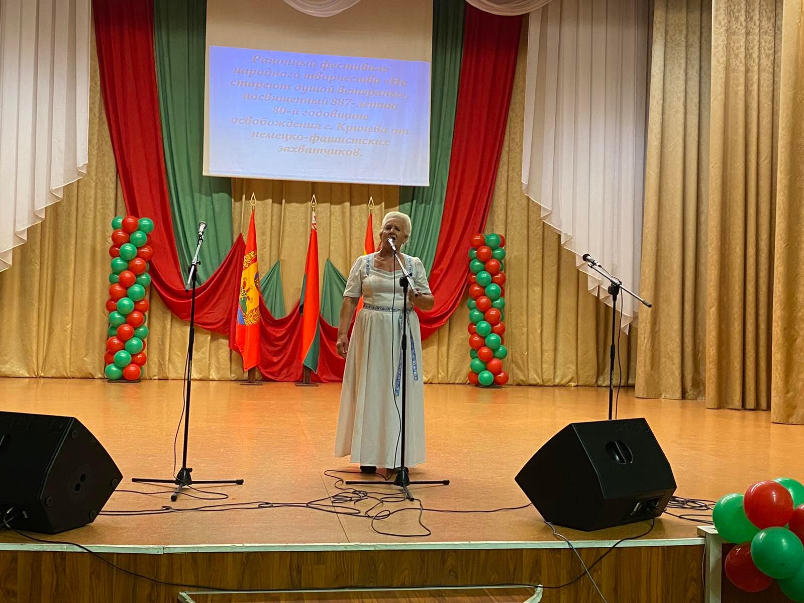 В преддверии Дня города в районном Центре культуры прошел районный фестиваль народного творчества «Не стареют душой ветераны», посвященный 887-летию и 80-летней годовщине освобождения г. Кричева от немецко-фашистских захватчиков. Цель фестиваля — создание условий для реализации творческого потенциала людей старшего поколения, содействие развитию художественной самодеятельности среди ветеранов, поддержка творческих и талантливых исполнителей.