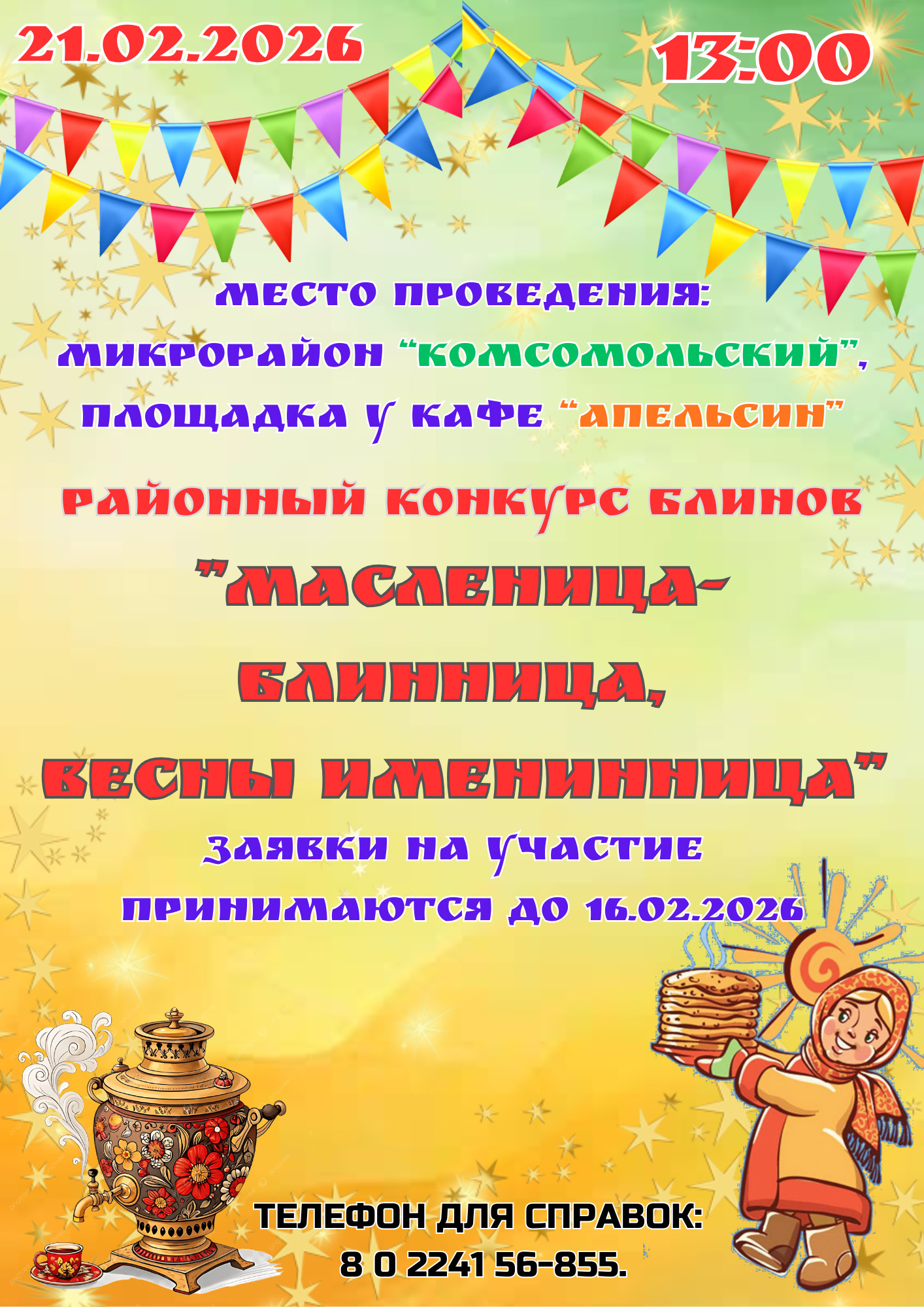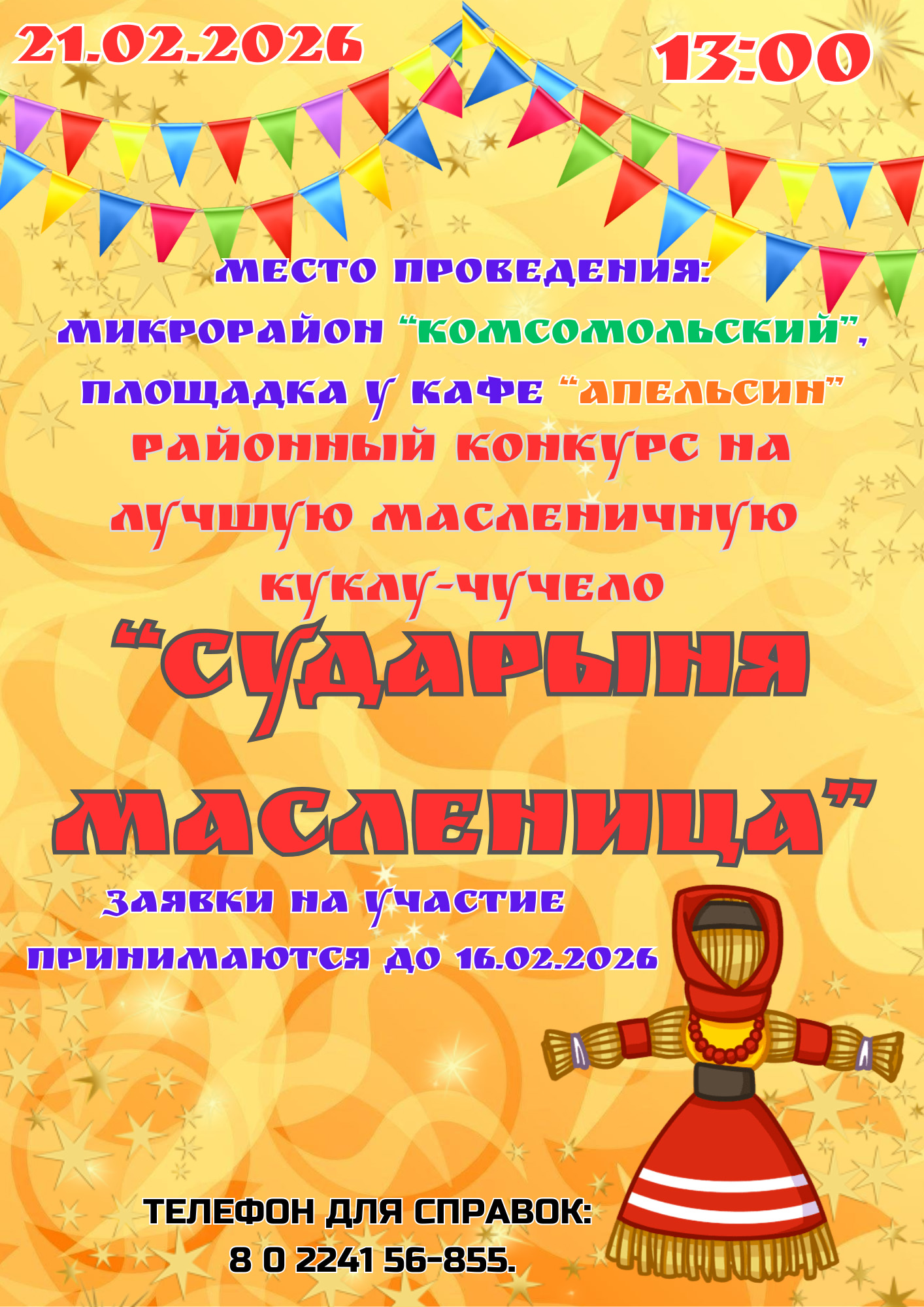 21 февраля 2026 года по адресу г. Кричев м-н «Комсомольский» площадка у кафе «Апельсин» районный Центр культуры приглашает принять участие в районном конкурсе блинов «Масленица-блинница, весны именинница», районном конкурсе на лучшую масленичную куклу-чучело «Сударыня Масленица».